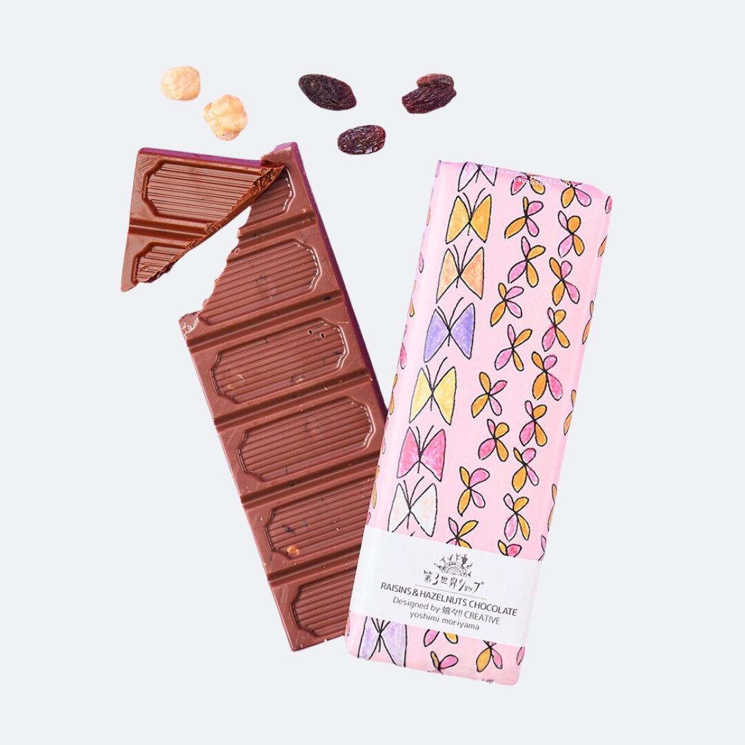 【原材料】有機全粉乳、有機粗糖、有機ココアバター、有機カカオマス、有機レーズン、有機ヘーゼルナッツ、有機黒糖、有機バニラ