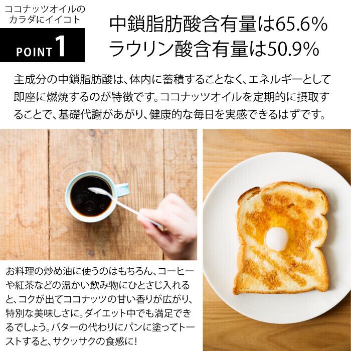 ココナッツオイルを定期的に摂取することで、基礎代謝があがり、健康的な毎日を実感できるでしょう。
