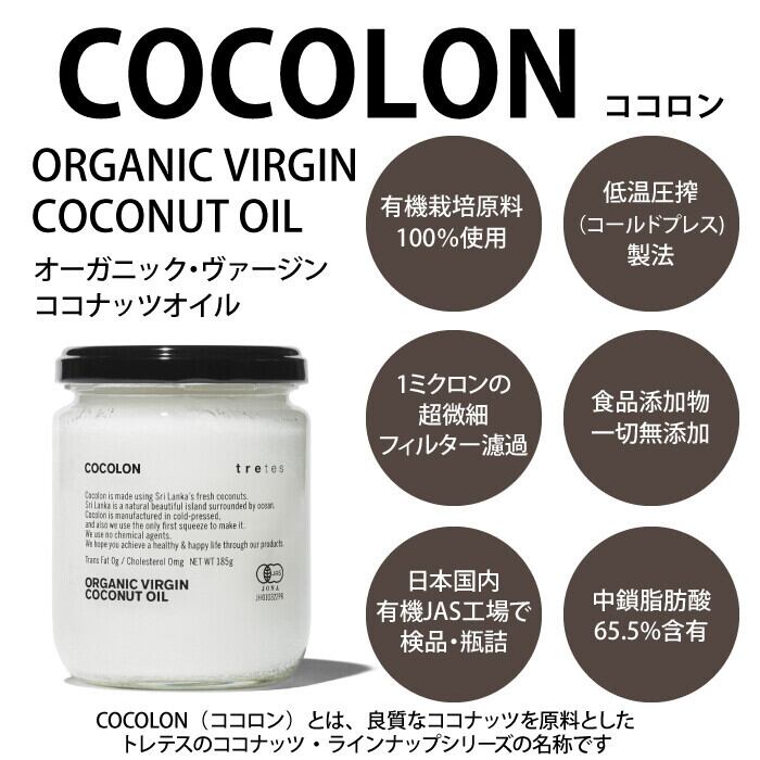 「COCOLON オーガニック・バージン・ココナッツオイル」の中鎖脂肪酸含有量は65.6%。ラウリン酸含有量は50.9%。主成分の中鎖脂肪酸は、体内に蓄積することなく、エネルギーとして即座に燃焼するのが特徴です。