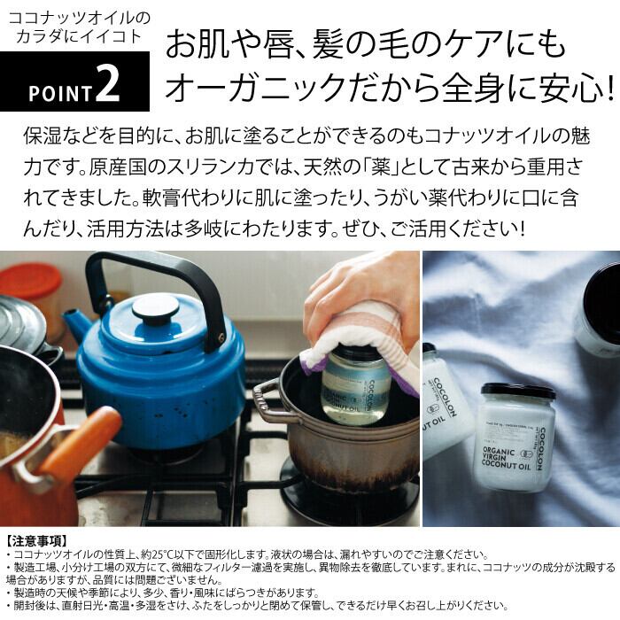 100%オーガニックのエキストラヴァージン・ココナッツオイルです。