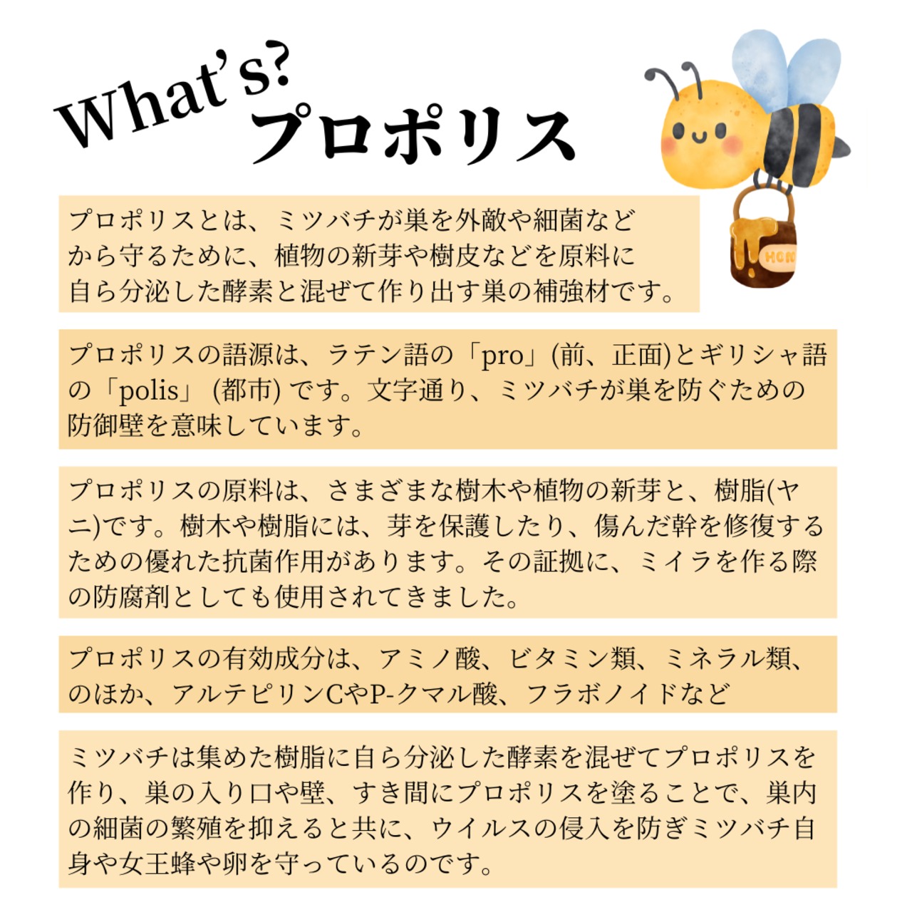 ※プロポリスエキスを製造する際にアルコールを使用します。本品においても1%未満のアルコール分が含有されている可能性があります。お子様やアルコールに弱い方はご注意ください。
