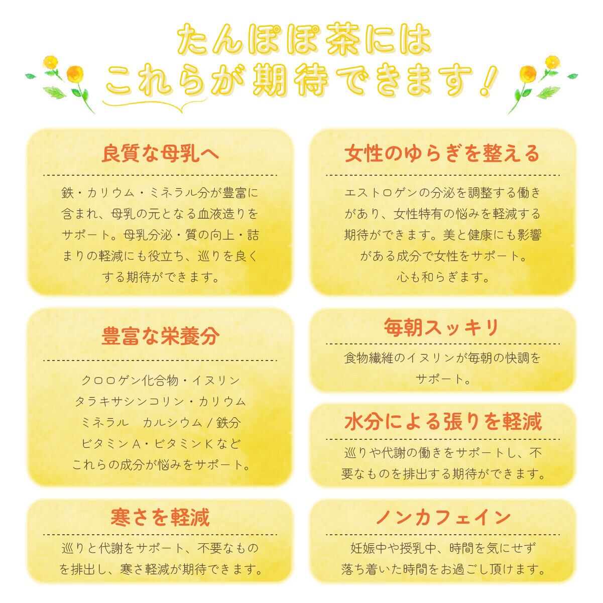ビタミン・ミネラル・鉄分が多く含まれているたんぽぽ茶。母乳育児のサポートに欠かせない栄養素、タラキサシンを多く含みます。